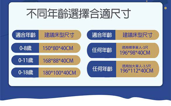 150X80, 168X88, 180X100, 標準單人196X100, 單人加大196X112