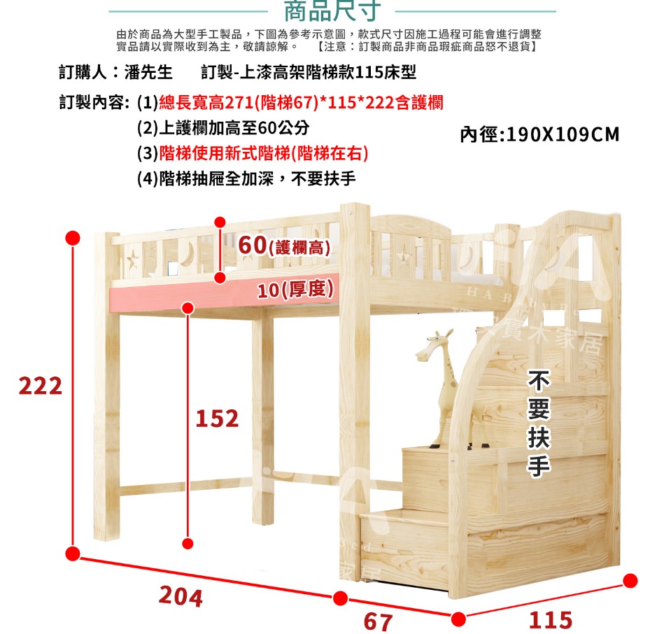 (1)床架總長寬高:上漆高架115階梯-271*115*222含護欄 $37500